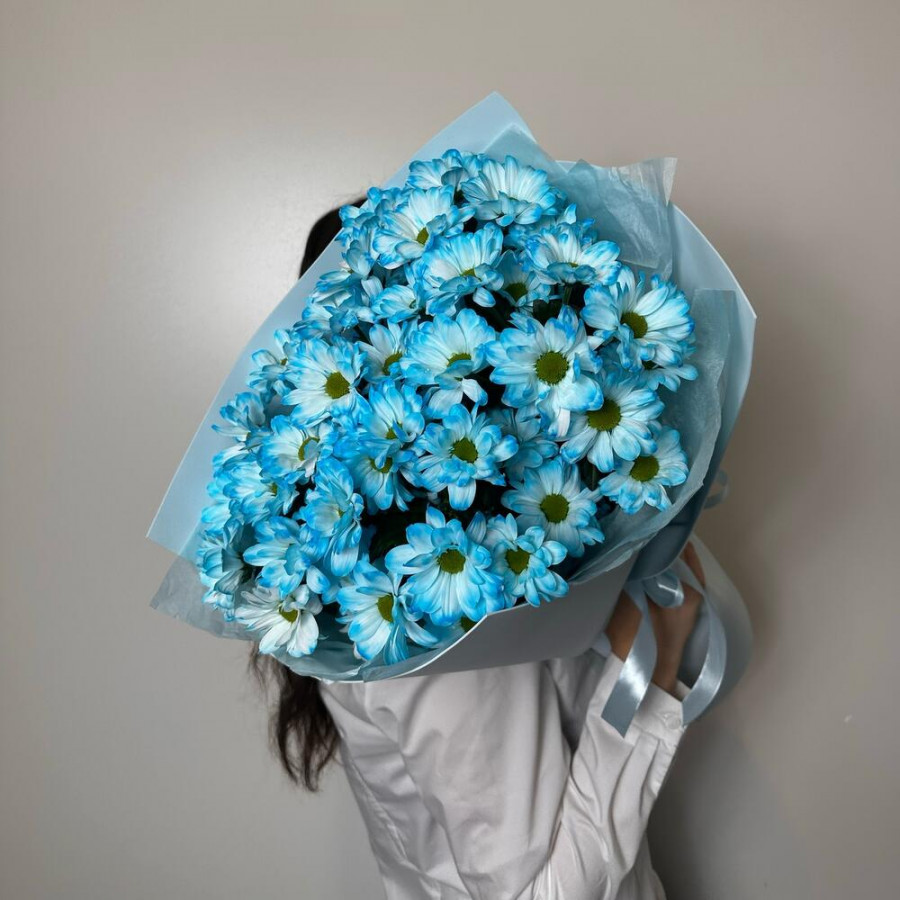На фото букет голубых ромашек. В составе: хризантема кустовая 5 шт, крафт-бумага 1 шт, атласная лента 1 шт, . Все цветы свежие и ароматные, букет красиво оформлен и отлично подходит для подарка. Доступна доставка цветов или самовывоз.