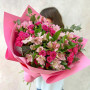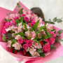 На фото букет из кустовых роз и альстромерий. В составе: кустовая роза 9 шт, альстромерия 15 шт, крафт-бумага 1 шт, атласная лента 1 шт, . Все цветы свежие и ароматные, букет красиво оформлен и отлично подходит для подарка. Доступна доставка цветов или самовывоз.