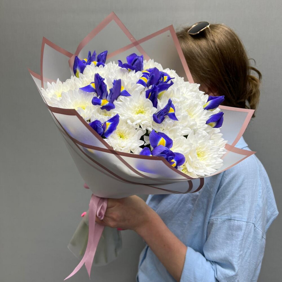На фото букет «снежная сказка». В составе: ирис 10 шт, хризантема кустовая 5 шт, дизайнерская упаковка 1 шт, атласная лента 1 шт, . Все цветы свежие и ароматные, букет красиво оформлен и отлично подходит для подарка. Доступна доставка цветов или самовывоз.